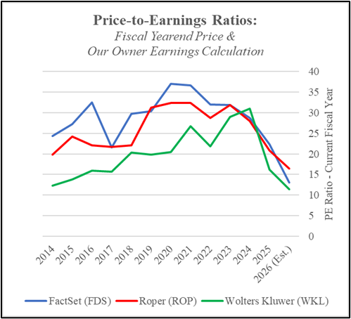 What happens when a coveted firm is suddenly loathed by investors? Nothing good, at least for its stock. The gap between “priced for perfection” and “priced for disruption” is large indeed. Glance at any software stock for proof. Many have fallen 40-60% in the past year. Sensing an opportunity, we bought three in Q1 – FactSet (FDS), Roper (ROP), and Wolters Kluwer (WKL in Amsterdam). We have long admired these firms. Until now, however, we were never tempted to buy them.